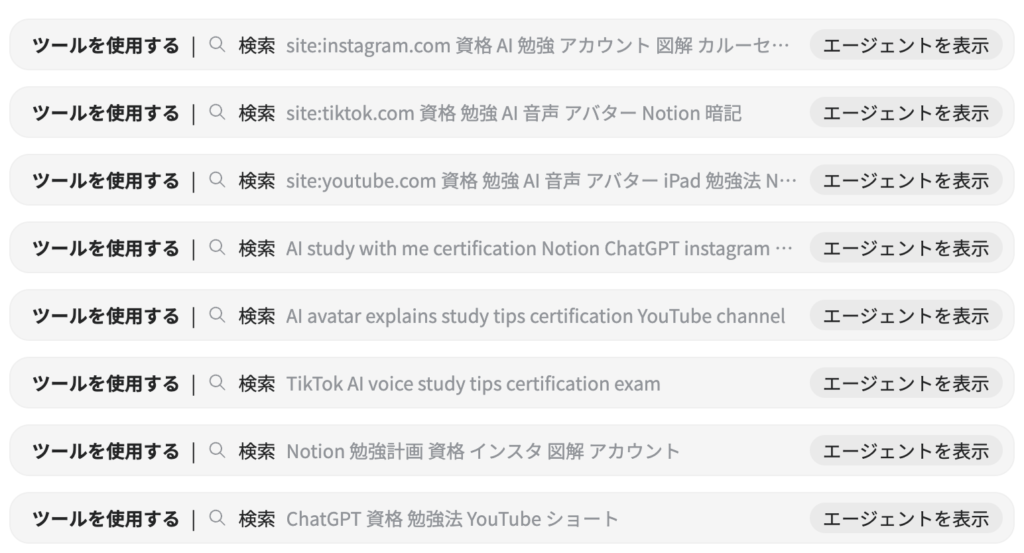 画面には「〇〇のサイトを確認中」「英語の論文を翻訳中」といった進捗が出ます。