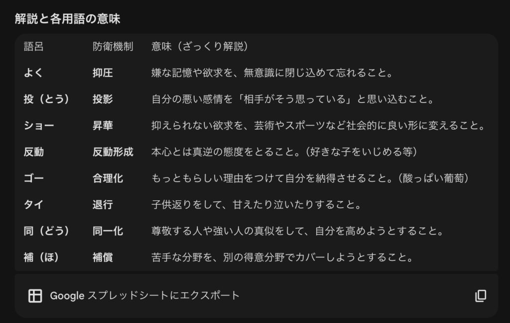 Geminiの回答例: 「「よく(抑圧)投(投影)げた! ショー(昇華)は反動(反動形成)で、ゴー(合理化)タイ(退行)同(同一化)補(補償)!」」